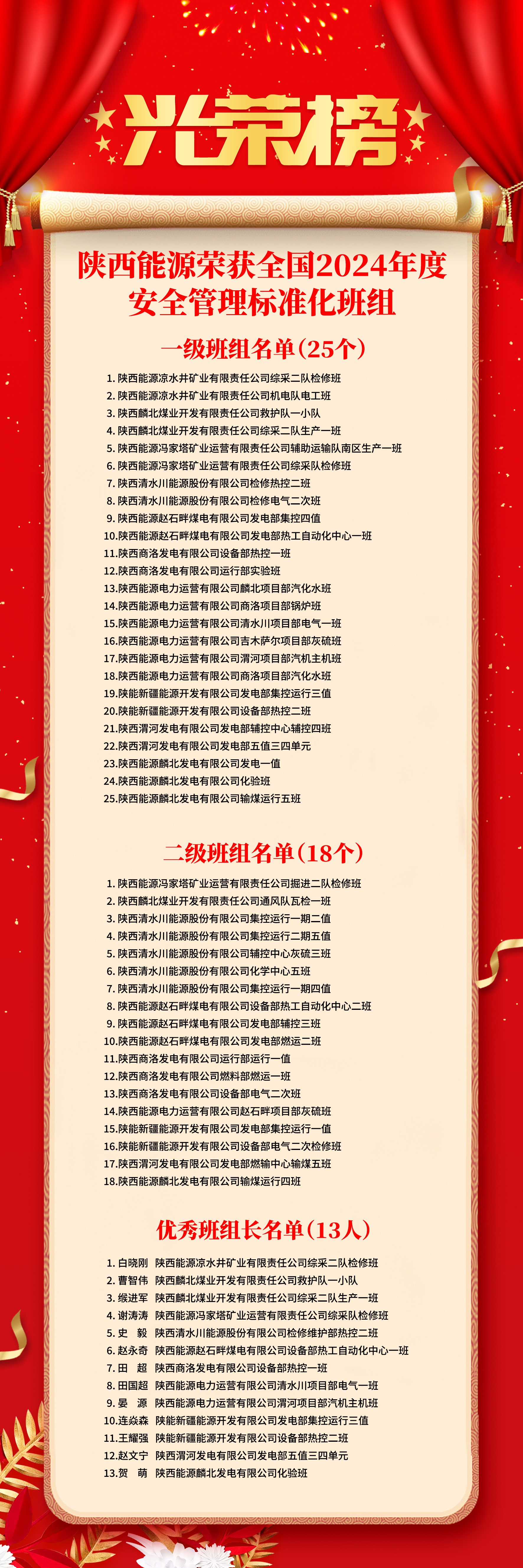 陜西能源全國2024年度安全管理標(biāo)準(zhǔn)化班組創(chuàng)建光榮榜